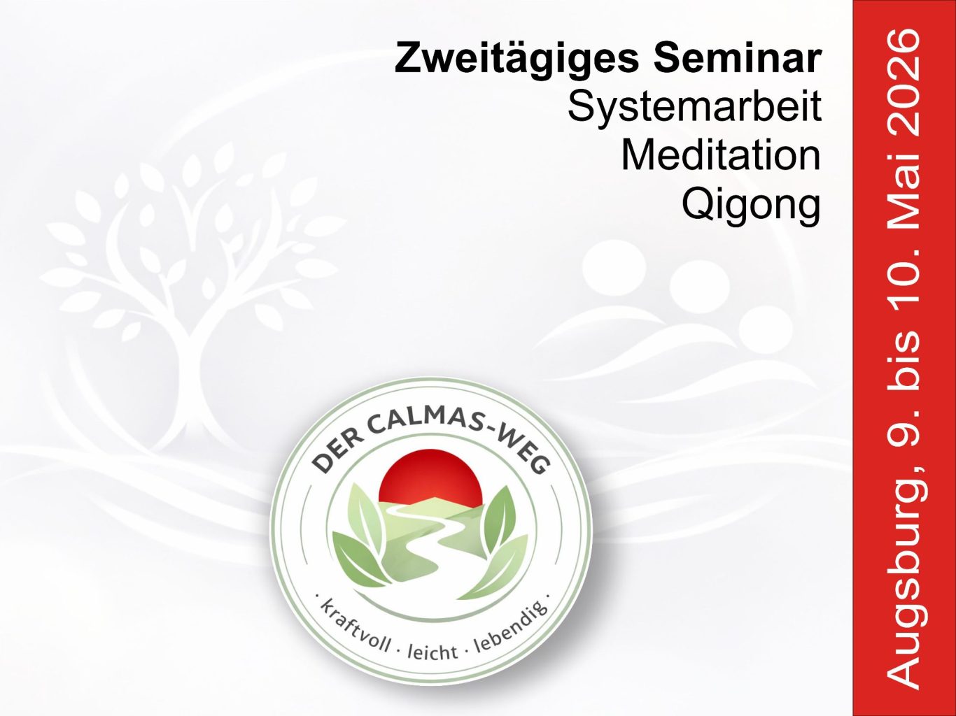 Der CALMAS-Weg verbindet innere und äußere Achtsamkeit (Qigong & Meditation) und Reflexion (systemische Klärung), vermittelt einen tiefen Zugang zu innerer Stärke und Selbstwahrnehmung: für ein ausgeglichenes und freudiges Leben.